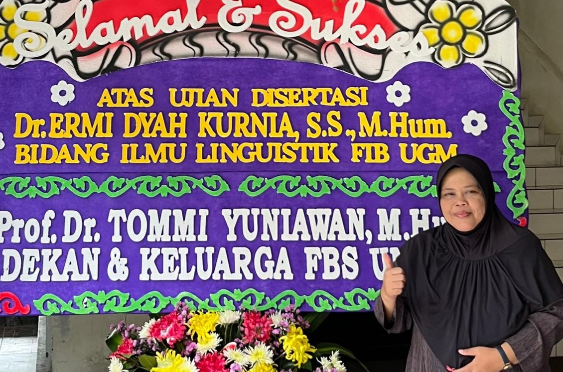 Ermi Dyah Kurnia meraih gelar doktor linguistik dari Program Studi Ilmu-ilmu Humaniora Fakultas Ilmu Budaya Universitas Gadjah Mada Yogyakarta, Senin 7 Juli 2025.