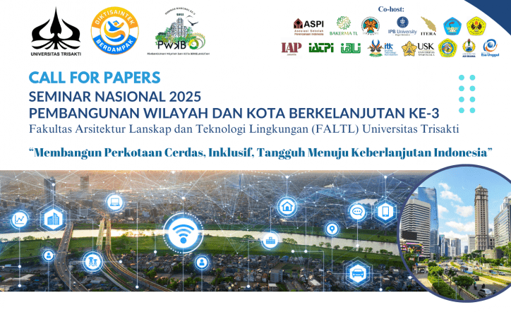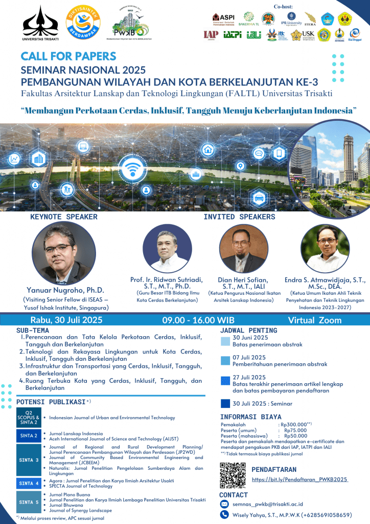 JAKARTA, INIKAMPUS – Fakultas Arsitektur Lanskap dan Teknologi Lingkungan (FALTL) Universitas Trisakti akan mengadakan Seminar Nasional Pembangunan Wilayah dan Kota Berkelanjutan (PWKB) Ke-3 Tahun 2025, pada 30 Juli 2025 mendatang.